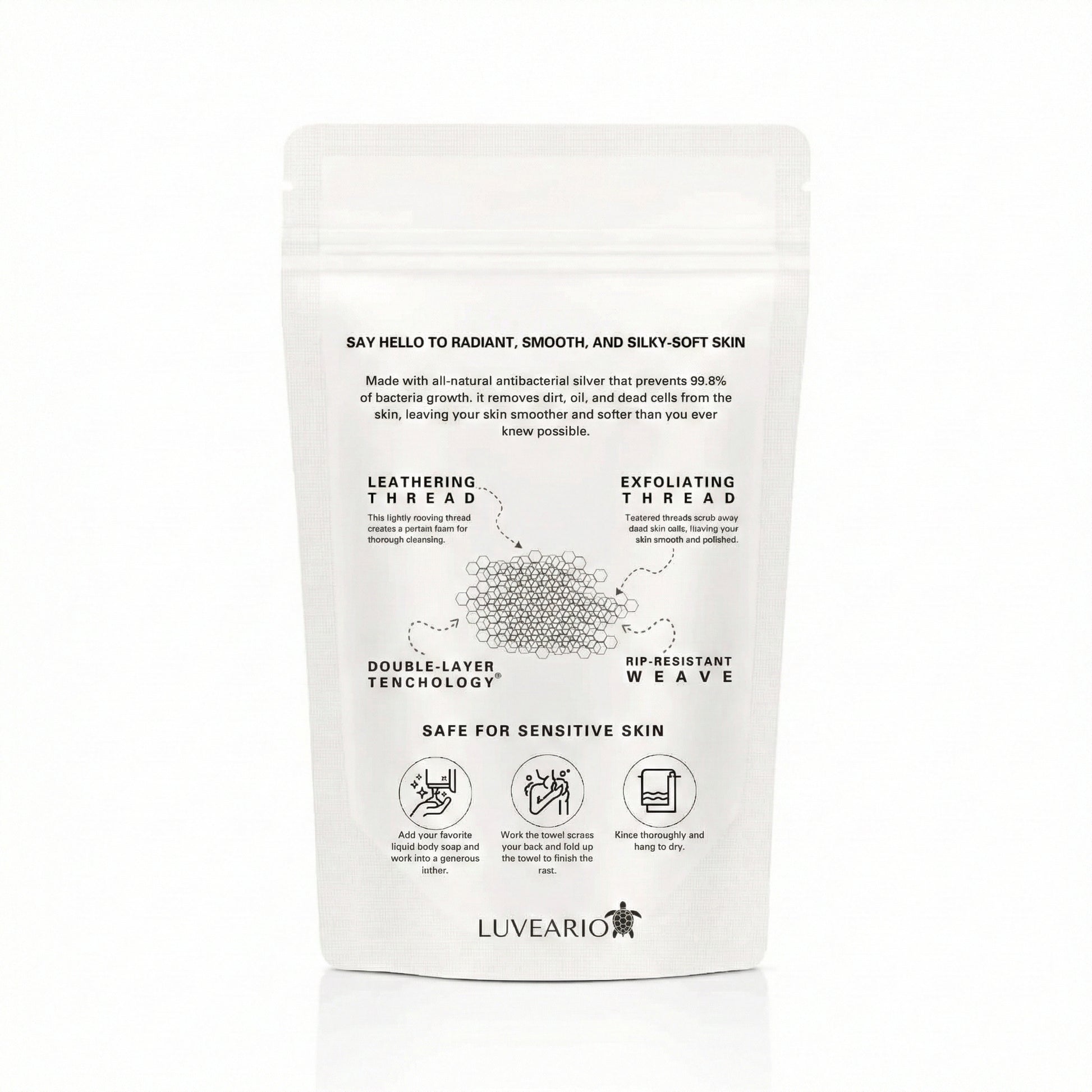 Infused with 99.9% pure silver ions that eliminate bacteria buildup and odors while keeping your skin naturally fresh and hygienic. Luveario gently removes dirt, oil, and dead skin cells without harsh chemicals, protecting your skin's moisture barrier while delivering deep exfoliation. Our advanced fabric dries in just 15 minutes, preventing bacterial growth and staying cleaner longer than any traditional product. Designed for dry, aging, and sensitive skin. Our balanced exfoliation technology gently exfoliates, stimulates collagen, and improves skin texture without irritation making it perfect for daily use.